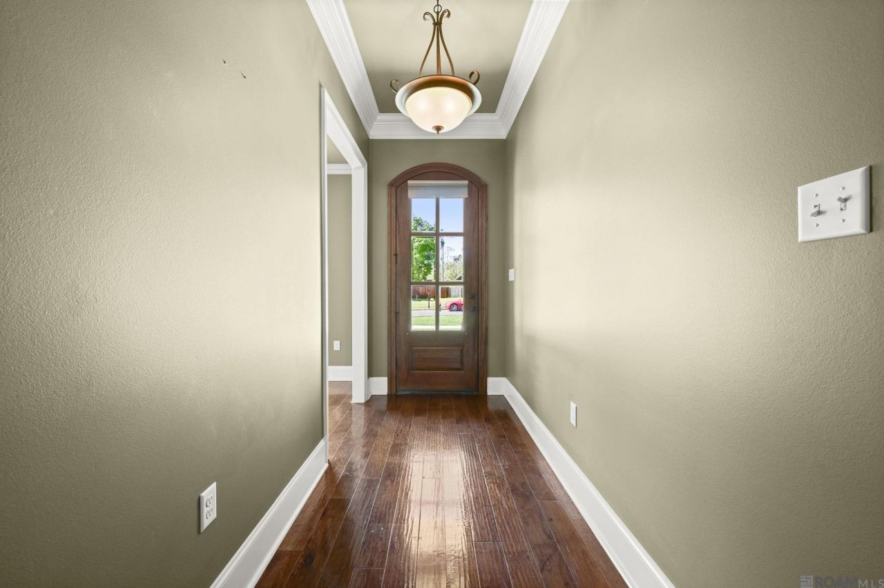 Tucked inside the desirable Wyndham Estates community in Denham Springs, this beautifully maintained home offers the perfect blend of comfort, space, and lifestyle convenience. From the moment you step inside, you're welcomed by hand-scraped wood floors flowing throughout the foyer, living room, office, and all bedrooms ? with no carpet anywhere in the home. The open living area features 10-foot ceilings and abundant natural light, creating an inviting space ideal for both relaxing and entertaining. The updated kitchen is designed for everyday living and gatherings alike, featuring quartz countertops and stainless steel appliances. Durable tile flooring runs through the kitchen, bathrooms, and laundry room for easy maintenance. Working from home? You'll love the private office just off the foyer, complete with built-in cabinetry for organization and productivity. The primary suite is a true retreat, featuring trayed ceilings with triple crown molding, a ceiling fan, and a spacious en-suite bath with soaking tub, separate shower, water closet, and a large walk-in closet with built-ins. Step outside to enjoy the large covered patio plus additional open patio area already plumbed for a future outdoor kitchen, perfect for entertaining or weekend grilling. The home sits on an oversized corner lot, with a peaceful canal and added tree-lined privacy behind the property. Additional highlights include: WHOLE house generator ? 2-car garage with storage area ? Sidewalk-lined neighborhood streets ? Popular Livingston Parish School District ? Did not flood. Located just minutes from Juban Crossing, Bass Pro Shops, I-12, schools and local parks, this home offers both convenience and a peaceful neighborhood setting. Schedule your private showing today and experience everything this Denham Springs home has to offer.